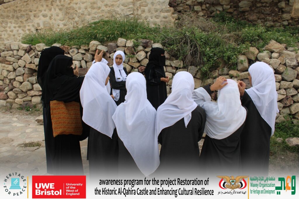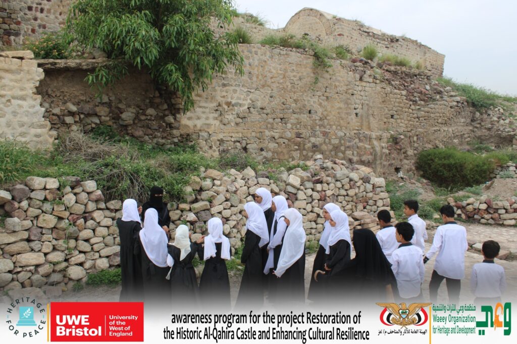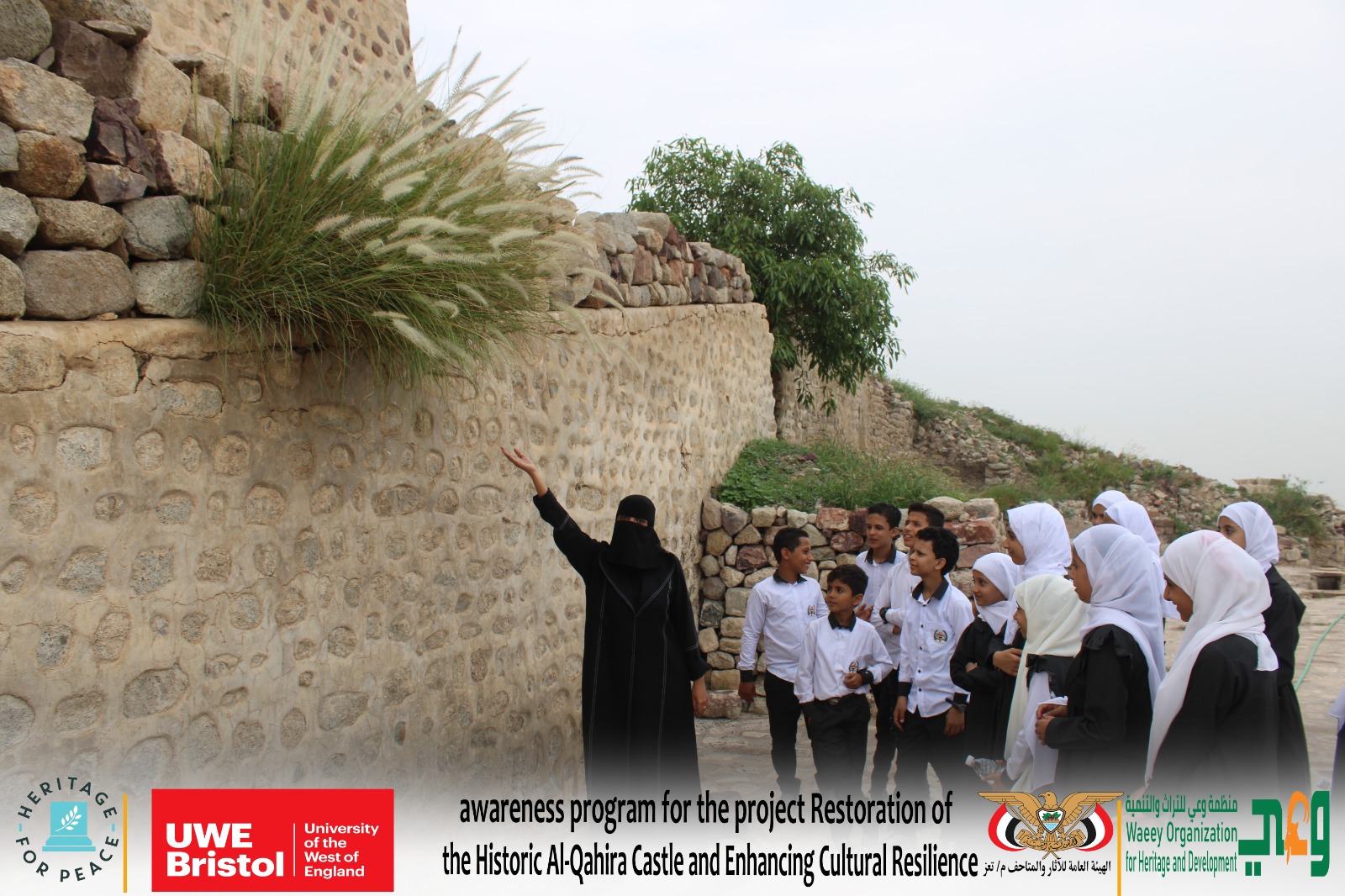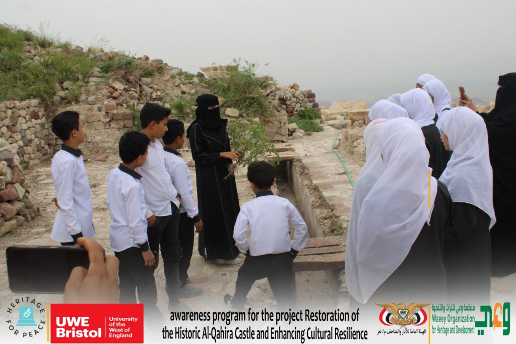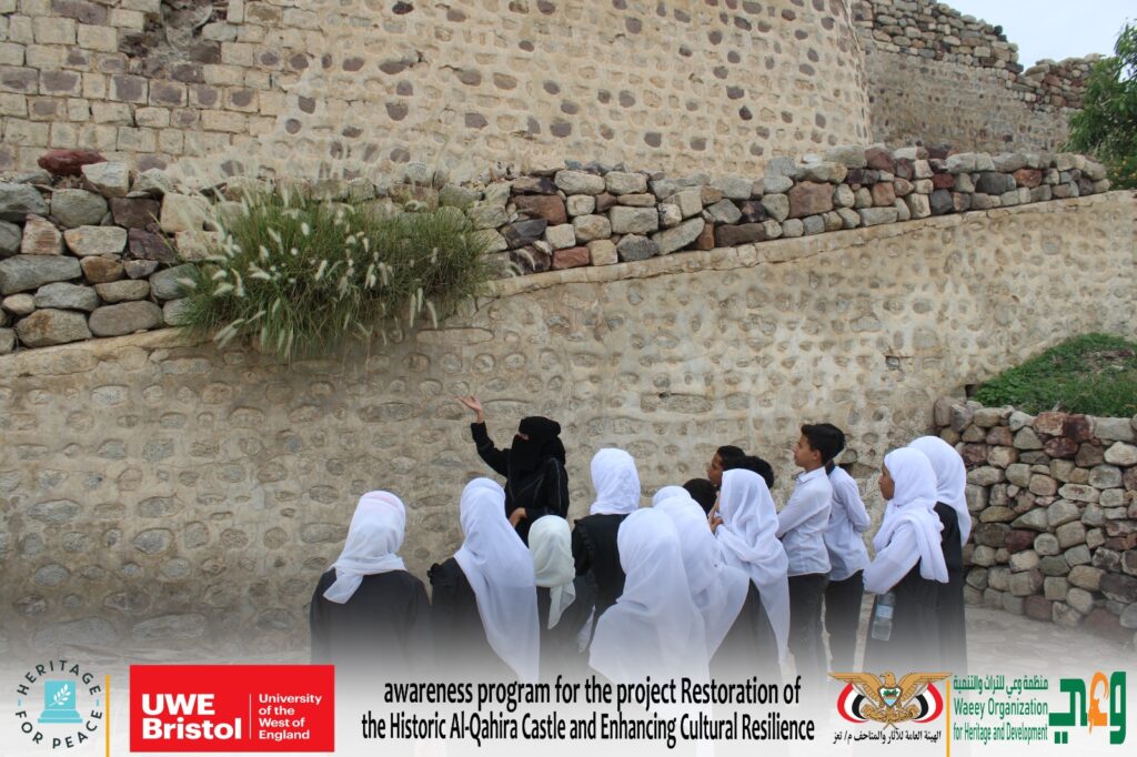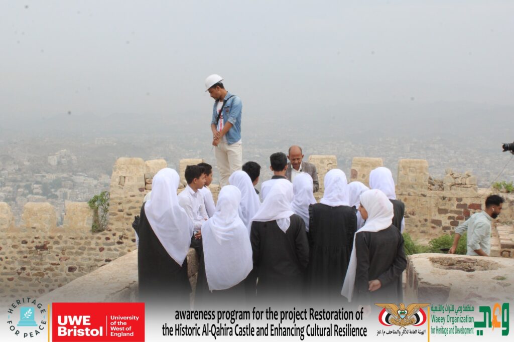Within the educational project which lunched last March , funded by the UWE Bristol Impact Accelerator Account ً(#AHRC-IAA), which aims to enhance the impact of scientific research in the fields of arts, humanities, and cultural heritage protection.and in partnership with Heritage for Peace organization and the Authority for Antiquities and Museums branch in Taiz; Waeey Organization for Heritage and Development is implementing the accompanying awareness program for the project “Restoration of the Historic Al-Qahira Castle and Enhancing Cultural Resilience”, in which school awareness is a prominent activity of this project due to its importance in reinforcing national values for the targeted students, connecting them to the cultural heritage of their ancestors and successive civilizations, emphasizing the importance of preserving cultural heritage, and promoting environmental awareness.